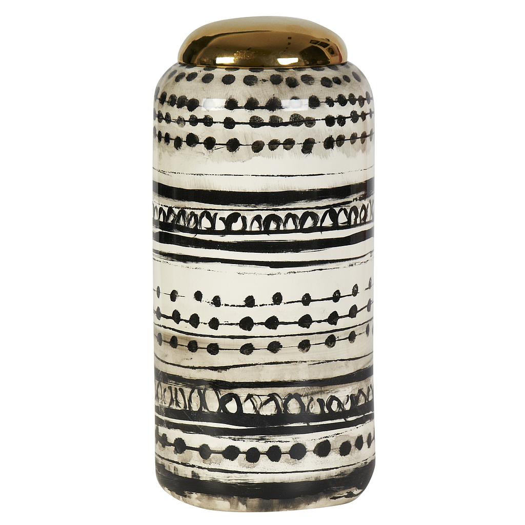 Description : WHITE JAR WITH ABSTACT BLACK PATTERN AND GOLDEN LID